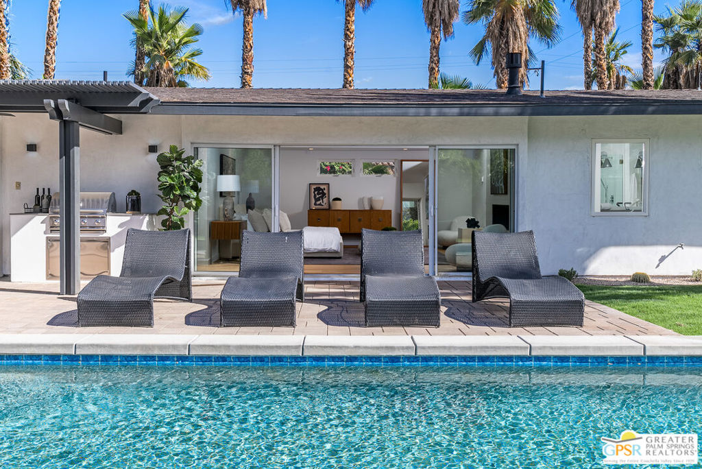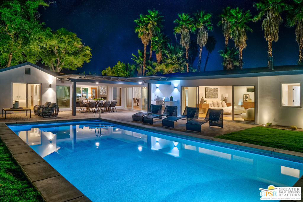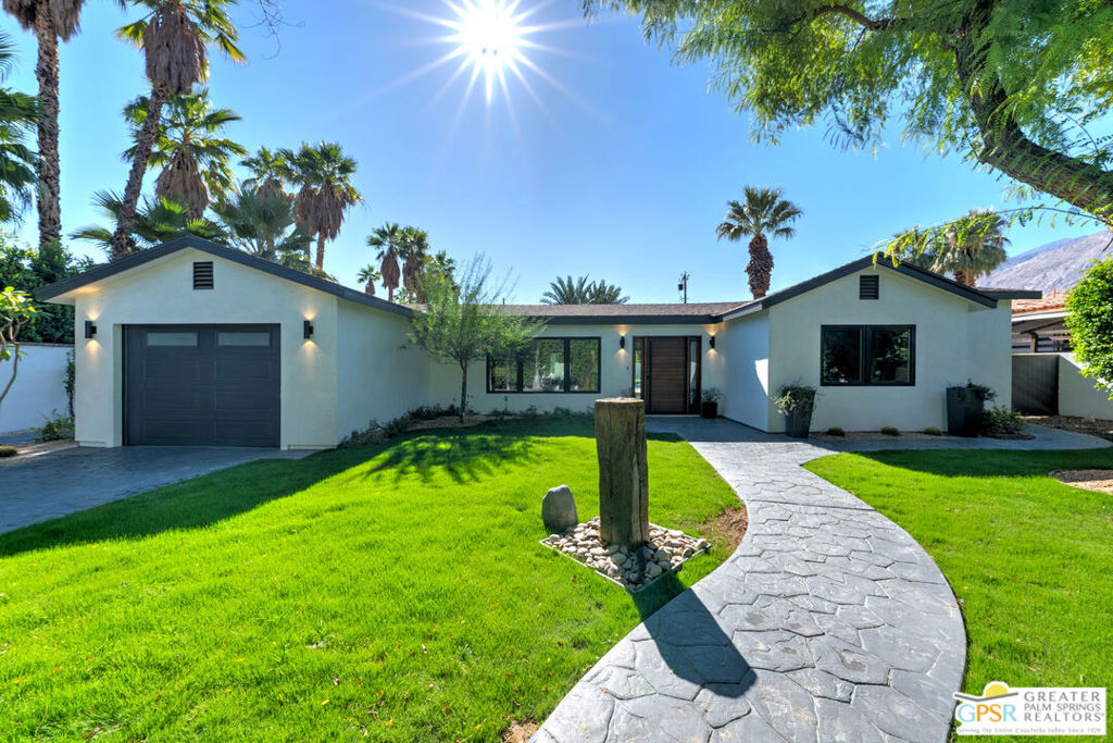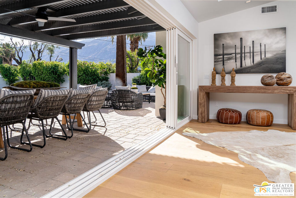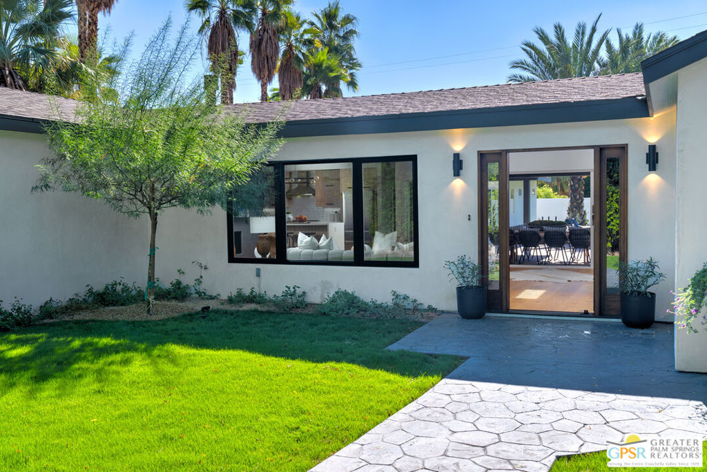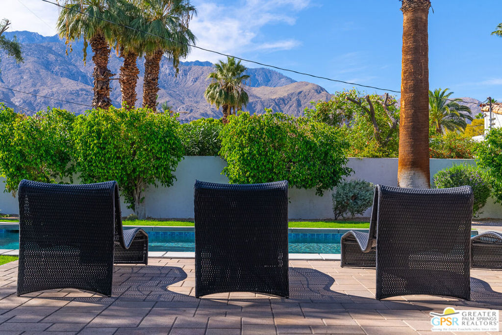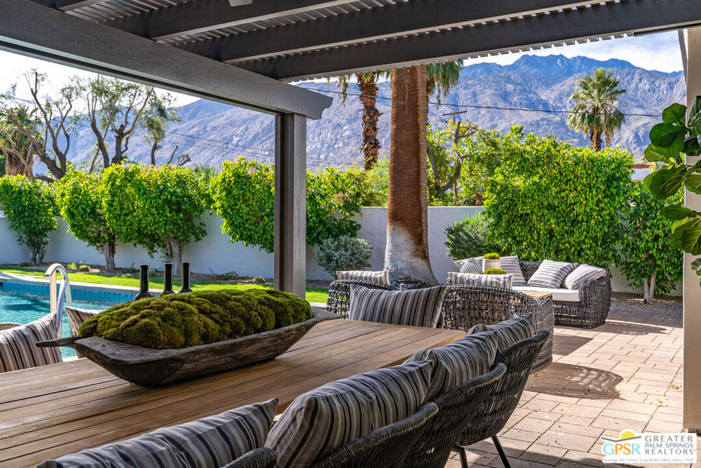 Ruth Hardy Park is 22 acres of rolling green lawns, tall trees and tennis courts at the heart of Palm Springs. The historic Movie Colony and Movie Colony East neighborhoods surround the park, and contain some of the most historic estates in town. Nestled therein, just six doors from the park itself, is 1075 E El Alameda. The home has an interesting history, built as a small bungalow in 1933, expanded in the late 1990s, and now completely reimagined and modernized in 2023. The lot itself has majestic views of the mountains, while the house is perfectly sited to enjoy those views. New picture windows and a series of sliders give the sense of a glass pavilion as you enter the property from the fully hedged gate and see straight through to the resort sized pebble tec pool, covered patio area with built in BBQ and grassy lawn. Completely upgraded and refreshed, from plumbing and electrical, to new smooth stucco exteriors, skylights, flooring, fixtures, cabinets, glazing, and Bertazzoni appliances. Kitchen and bathrooms are entirely new. The primary suite enjoys double walk in closets, new fireplace, and mountain views from bed. Fully separate guest and primary wings with dual zone AC. This has the overall feeling of new construction with the charm of a California bungalow in a mature, established neighborhood. There is no HOA and you own the land. In addition to the park, the home is walkable to the prime strip of downtown's best restaurants and shopping. But why would you ever leave? Welcome to your oasis in the desert.