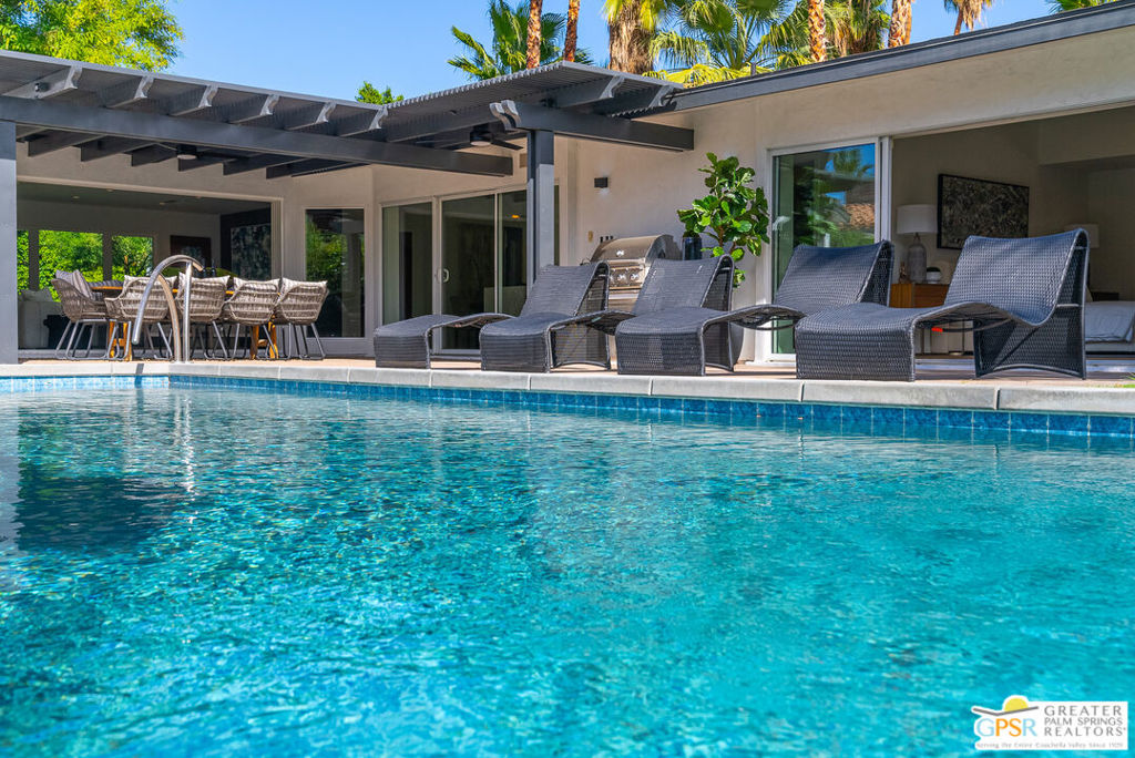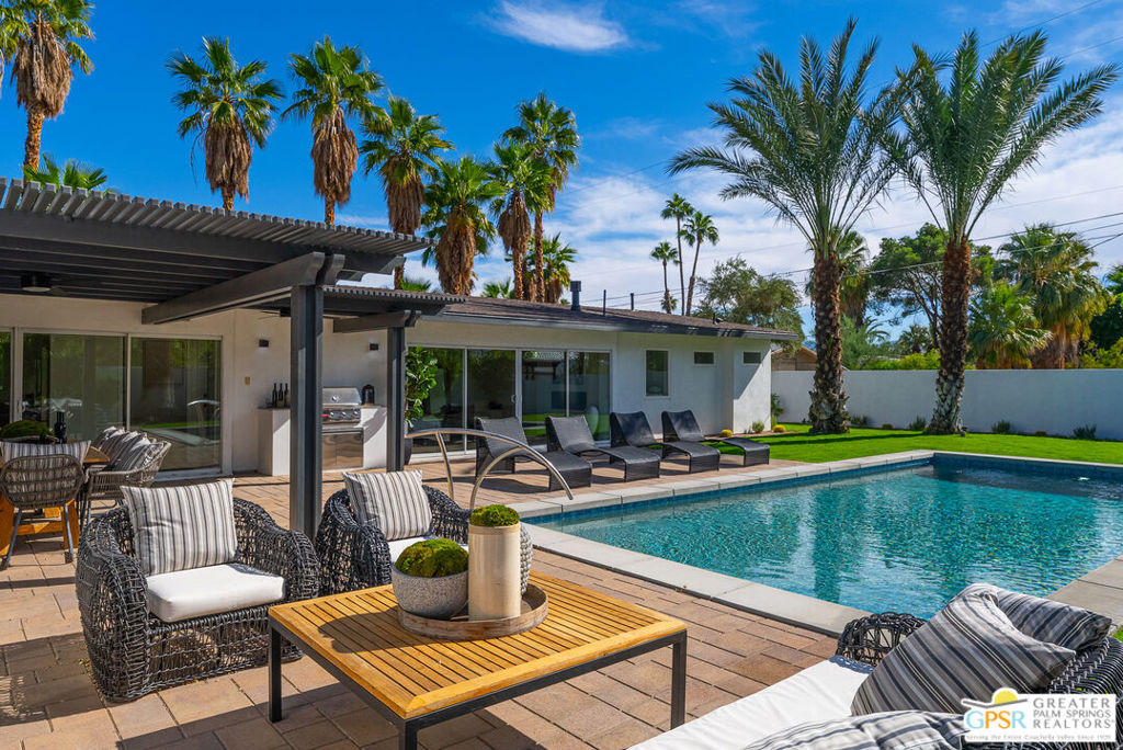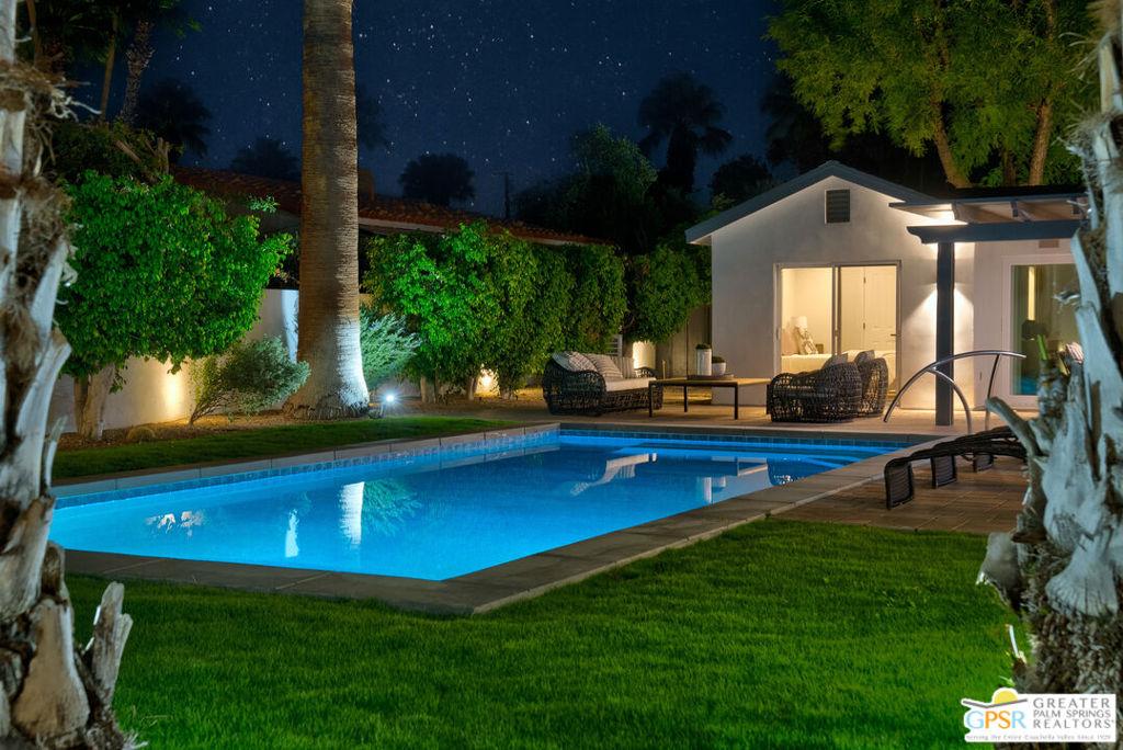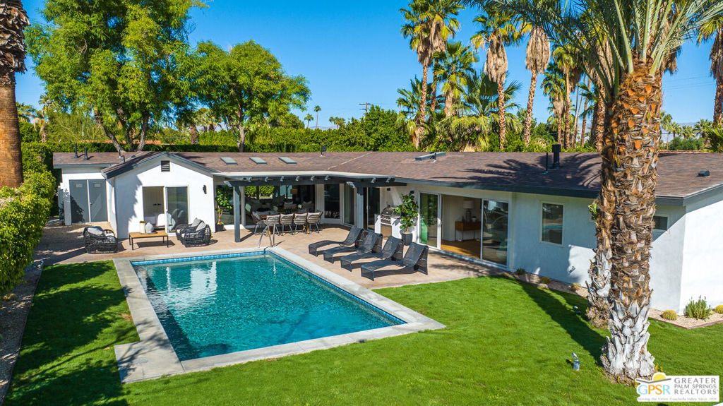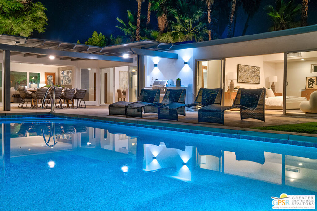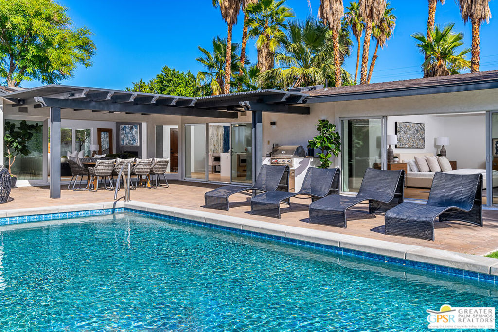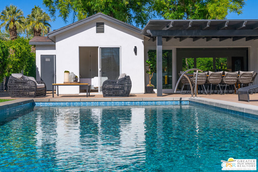 Ruth Hardy Park is 22 acres of rolling green lawns, tall trees and tennis courts at the heart of Palm Springs. The historic Movie Colony and Movie Colony East neighborhoods surround the park, and contain some of the most historic estates in town. Nestled therein, just six doors from the park itself, is 1075 E El Alameda. The home has an interesting history, built as a small bungalow in 1933, expanded in the late 1990s, and now completely reimagined and modernized in 2023. The lot itself has majestic views of the mountains, while the house is perfectly sited to enjoy those views. New picture windows and a series of sliders give the sense of a glass pavilion as you enter the property from the fully hedged gate and see straight through to the resort sized pebble tec pool, covered patio area with built in BBQ and grassy lawn. Completely upgraded and refreshed, from plumbing and electrical, to new smooth stucco exteriors, skylights, flooring, fixtures, cabinets, glazing, and Bertazzoni appliances. Kitchen and bathrooms are entirely new. The primary suite enjoys double walk in closets, new fireplace, and mountain views from bed. Fully separate guest and primary wings with dual zone AC. This has the overall feeling of new construction with the charm of a California bungalow in a mature, established neighborhood. There is no HOA and you own the land. In addition to the park, the home is walkable to the prime strip of downtown's best restaurants and shopping. But why would you ever leave? Welcome to your oasis in the desert.