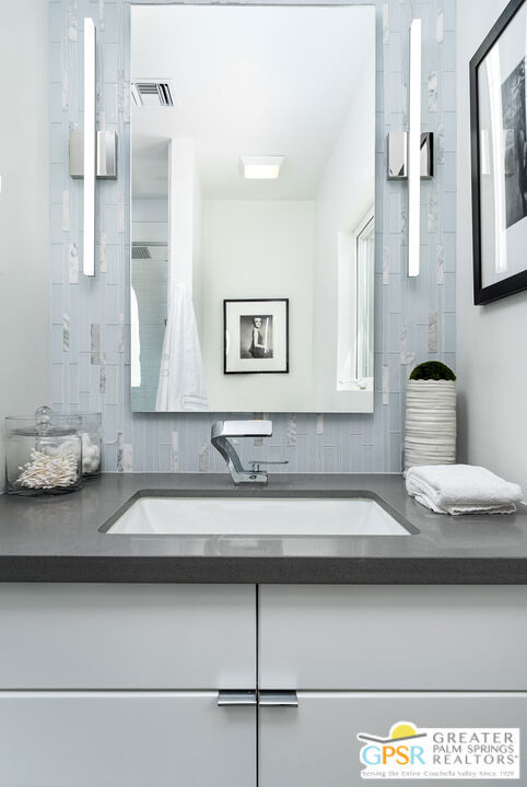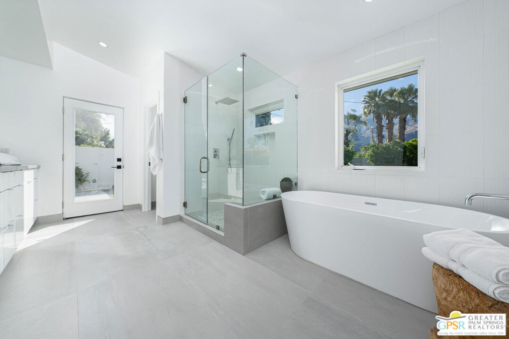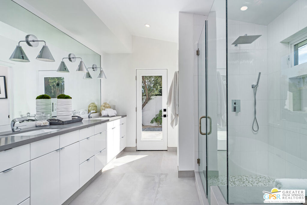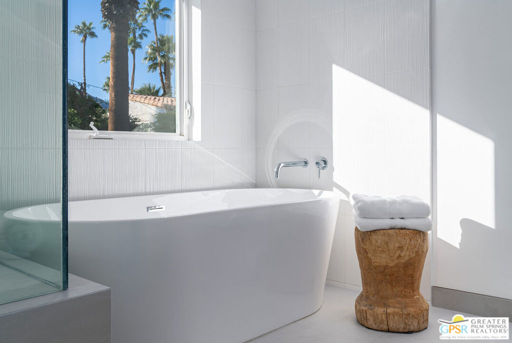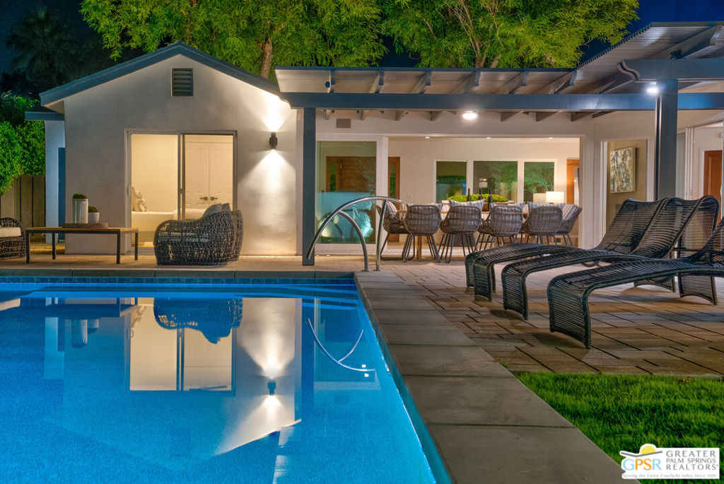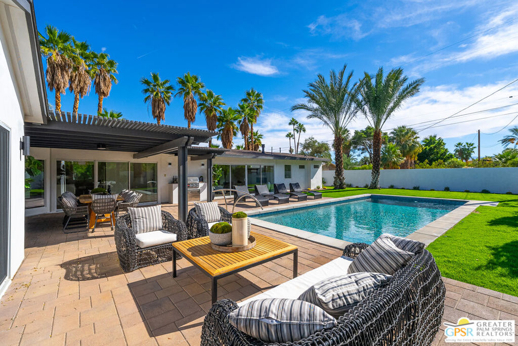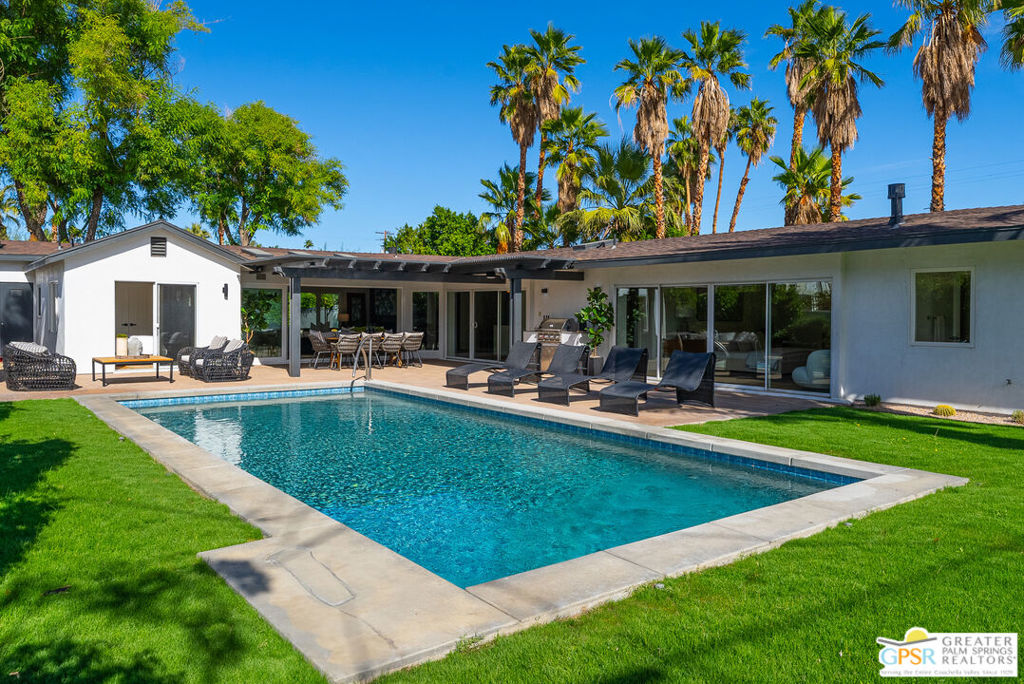 Ruth Hardy Park is 22 acres of rolling green lawns, tall trees and tennis courts at the heart of Palm Springs. The historic Movie Colony and Movie Colony East neighborhoods surround the park, and contain some of the most historic estates in town. Nestled therein, just six doors from the park itself, is 1075 E El Alameda. The home has an interesting history, built as a small bungalow in 1933, expanded in the late 1990s, and now completely reimagined and modernized in 2023. The lot itself has majestic views of the mountains, while the house is perfectly sited to enjoy those views. New picture windows and a series of sliders give the sense of a glass pavilion as you enter the property from the fully hedged gate and see straight through to the resort sized pebble tec pool, covered patio area with built in BBQ and grassy lawn. Completely upgraded and refreshed, from plumbing and electrical, to new smooth stucco exteriors, skylights, flooring, fixtures, cabinets, glazing, and Bertazzoni appliances. Kitchen and bathrooms are entirely new. The primary suite enjoys double walk in closets, new fireplace, and mountain views from bed. Fully separate guest and primary wings with dual zone AC. This has the overall feeling of new construction with the charm of a California bungalow in a mature, established neighborhood. There is no HOA and you own the land. In addition to the park, the home is walkable to the prime strip of downtown's best restaurants and shopping. But why would you ever leave? Welcome to your oasis in the desert.