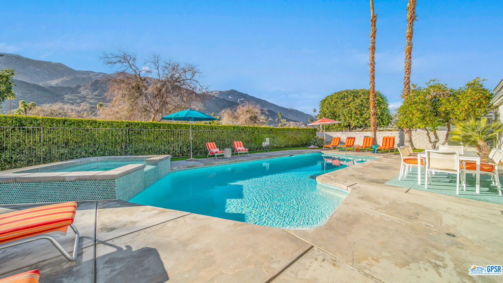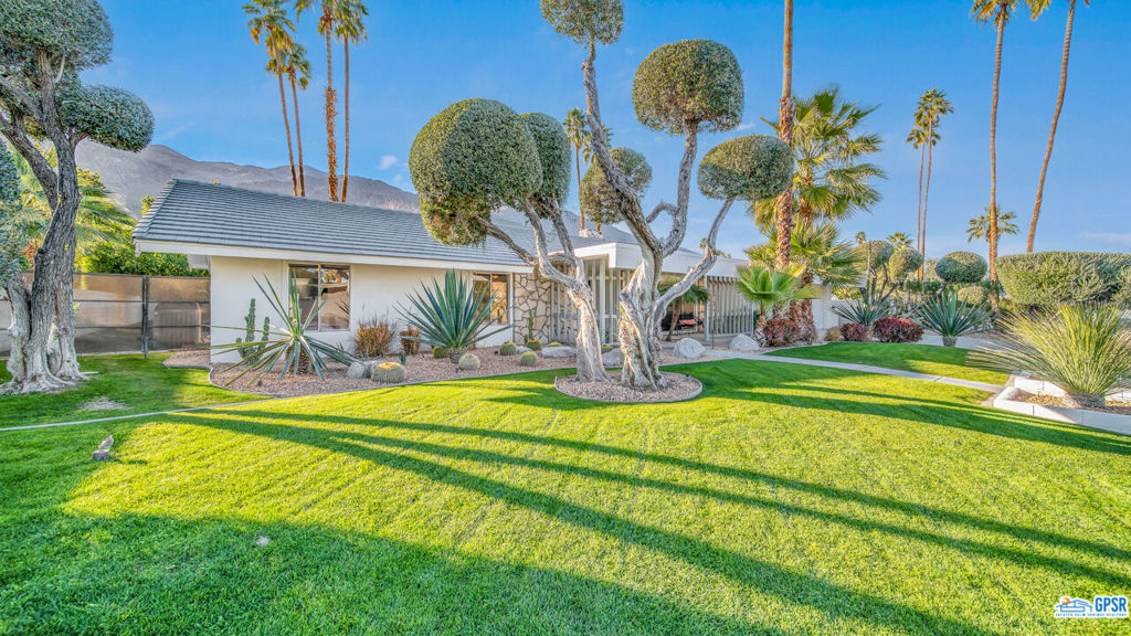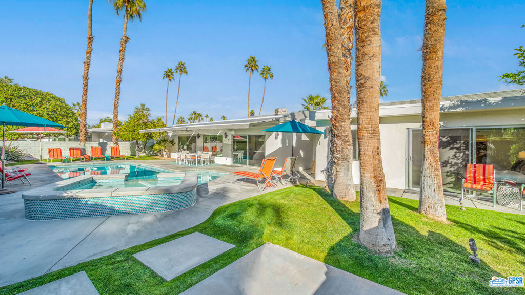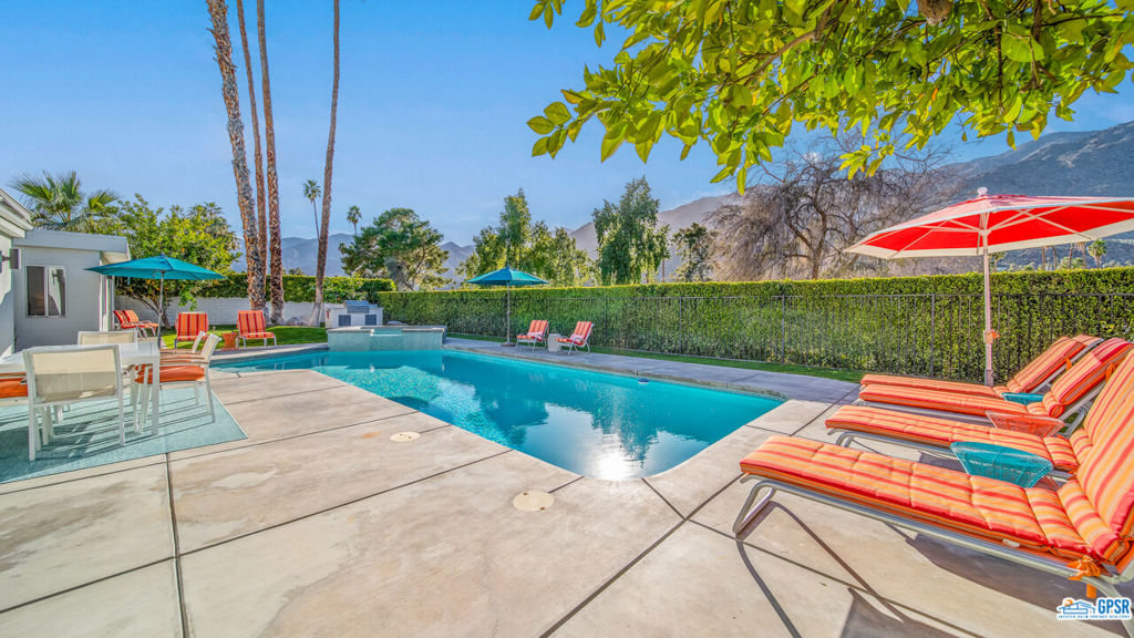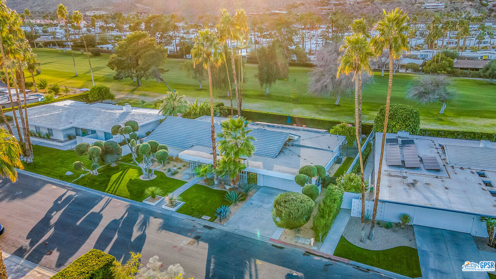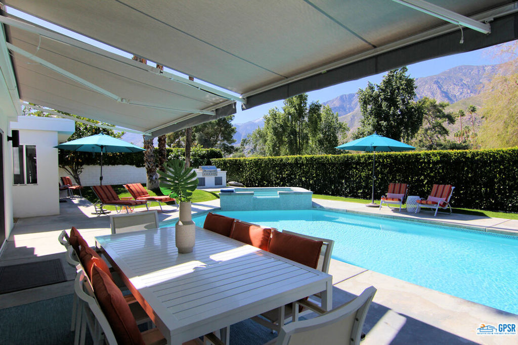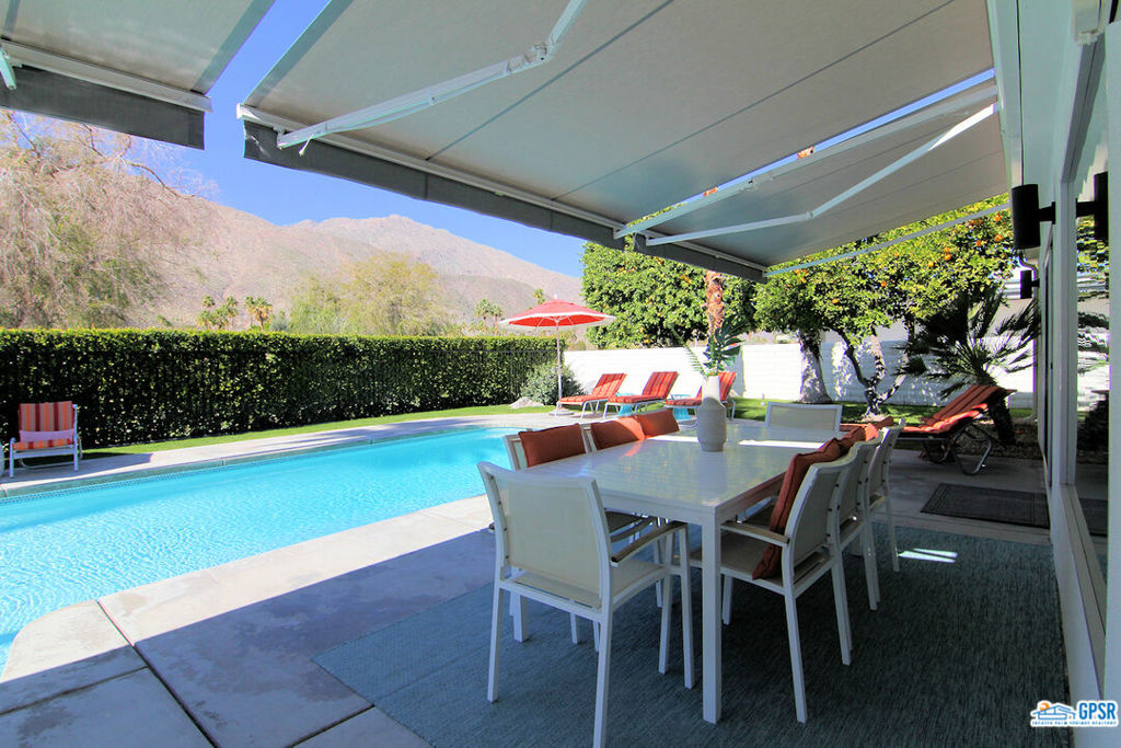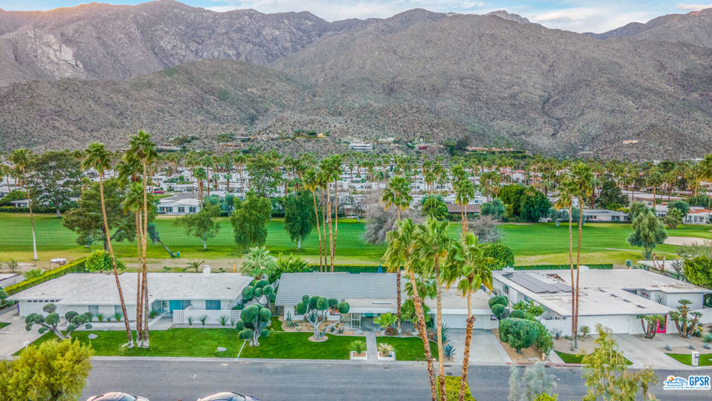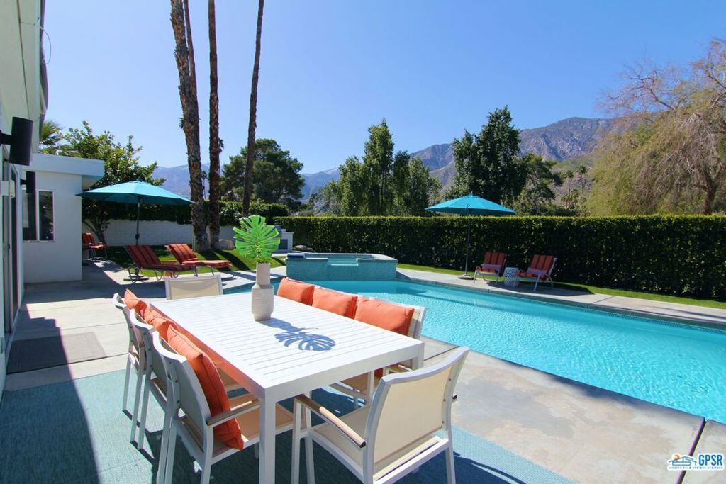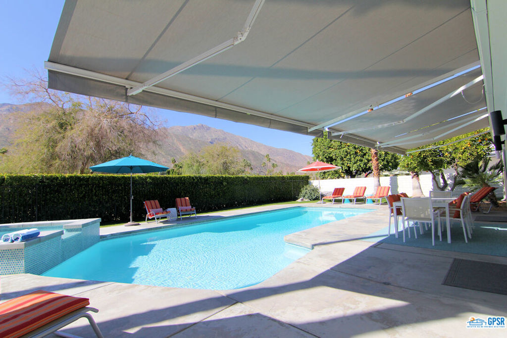Built in 1963, this classic mid-century modern property was one of the original homes in Harry Kelso's visionary Canyon Country Club Estates, now known as Indian Canyons. Re-imagined for today's living, the open, flowing spaces enjoy spectacular views of the San Jacinto mountains from virtually every room. Clean architectural lines, period details and modern finishes and appliances blend seamlessly in the spacious 4 bedroom, 3 bath floorplan (with dual primary suites). Sited on the 6th fairway of the north course, the resort-like grounds feature a new spa and rebuilt salt water pool, hedged for privacy and gently shaded by motorized awnings. Near golf, hiking, restaurants, and downtown Palm Springs, this is a very special desert retreat.