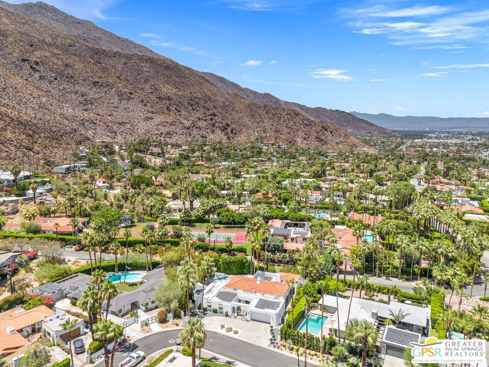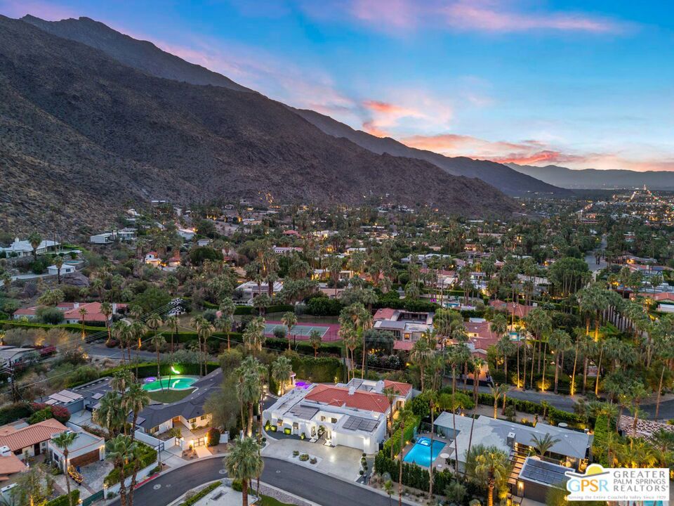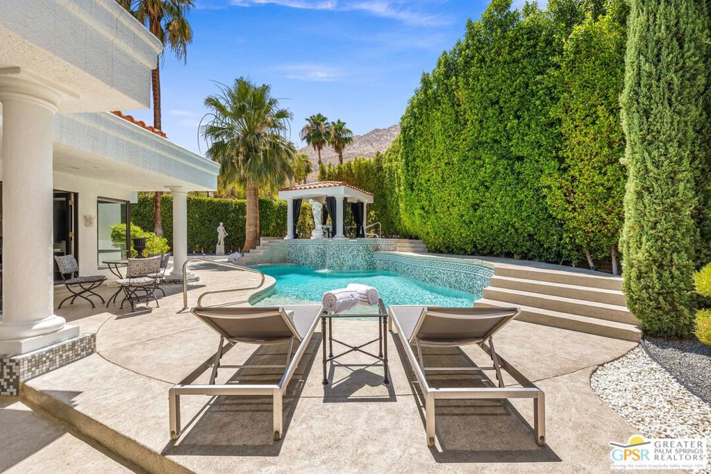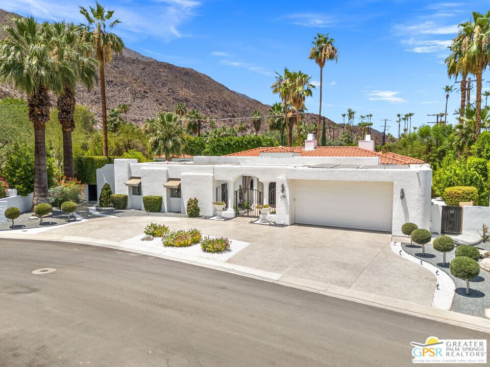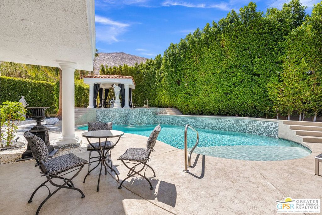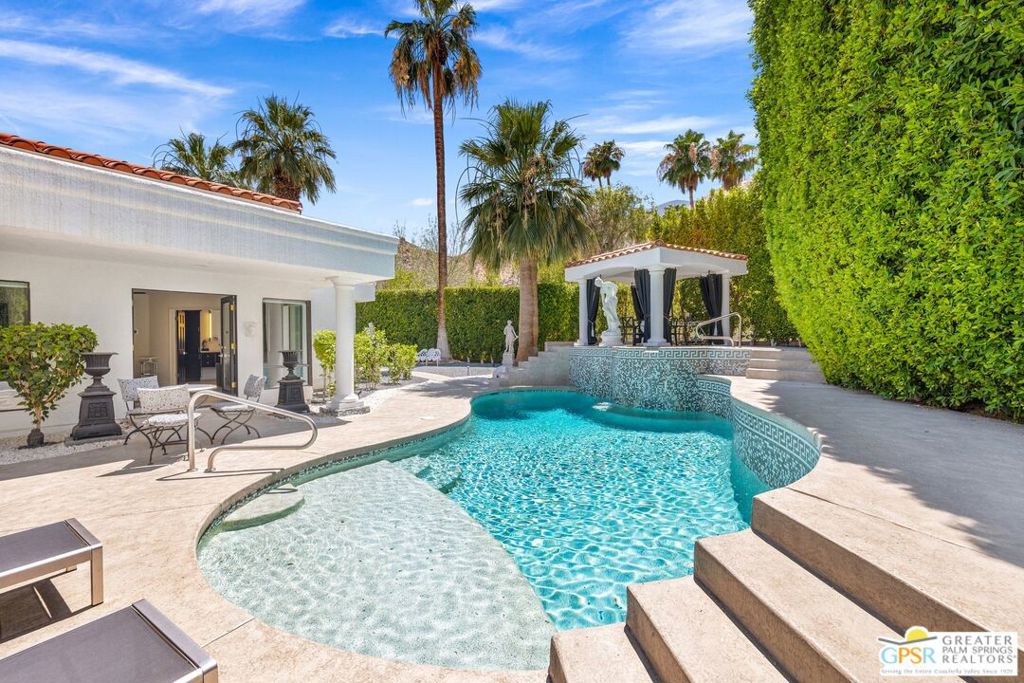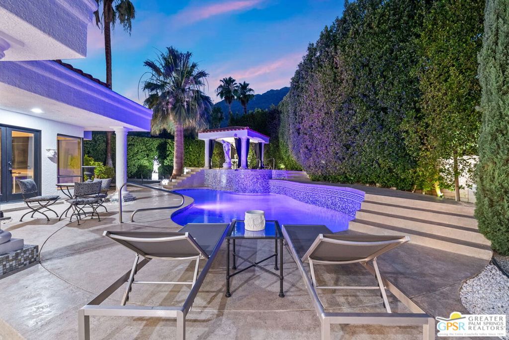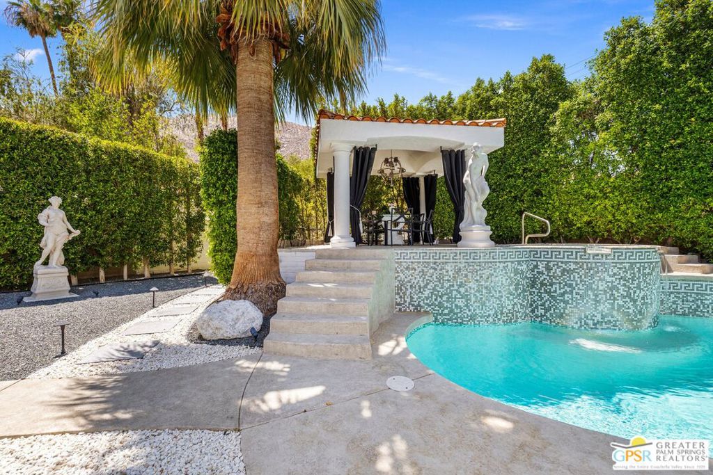 A Magical Setting in The Mesa! Perfectly positioned in one of South Palm Springs' most cherished and storied neighborhoods, this elegant 4 BED, 4.5 BATH residence offers a seamless blend of style, comfort, and desert sophistication. Set on land you own (Fee Simple) with OWNED SOLAR, the property features a circular driveway leading to a beautifully appointed 4 bedroom ensuite home. Designed for both everyday luxury and entertaining, the residence wraps around a stunning pool and spa with waterfall, dramatic mosaic tile accents, an elevated gazebo framed by mountain views and swaying palms. Multiple outdoor conversation areas enhance this ultra-private setting. The gated courtyard entry and double doors open to formal living and dining spaces with dual fireplaces and a custom bar area, also ideal as a destination-style media lounge. Notable lighting throughout includes Baccarat fixtures that complement the home's subtle nod to Hollywood Regency design. The chef's kitchen features high-end finishes, a generous buffet, walk-in pantry, and breakfast area with patio access. The spacious primary retreat offers direct pool access, a Carrara marble-lined shower, and a freestanding clawfoot tub. Two additional guest suites are thoughtfully positioned along the west wing, each with private full baths. The attached casita, located in the east wing, features two sets of French doors that open to the outdoors and floor-to-ceiling built-in bookcases. This generous space functions beautifully as a second primary suite or private retreat.Additional highlights include a large utility room, direct garage access, and a secondary entrance off Carmelita Street, perfect for pool guests or staff. Take the Matterport Virtual Tour to experience the flow and finish of this exceptional South Palm Springs property.