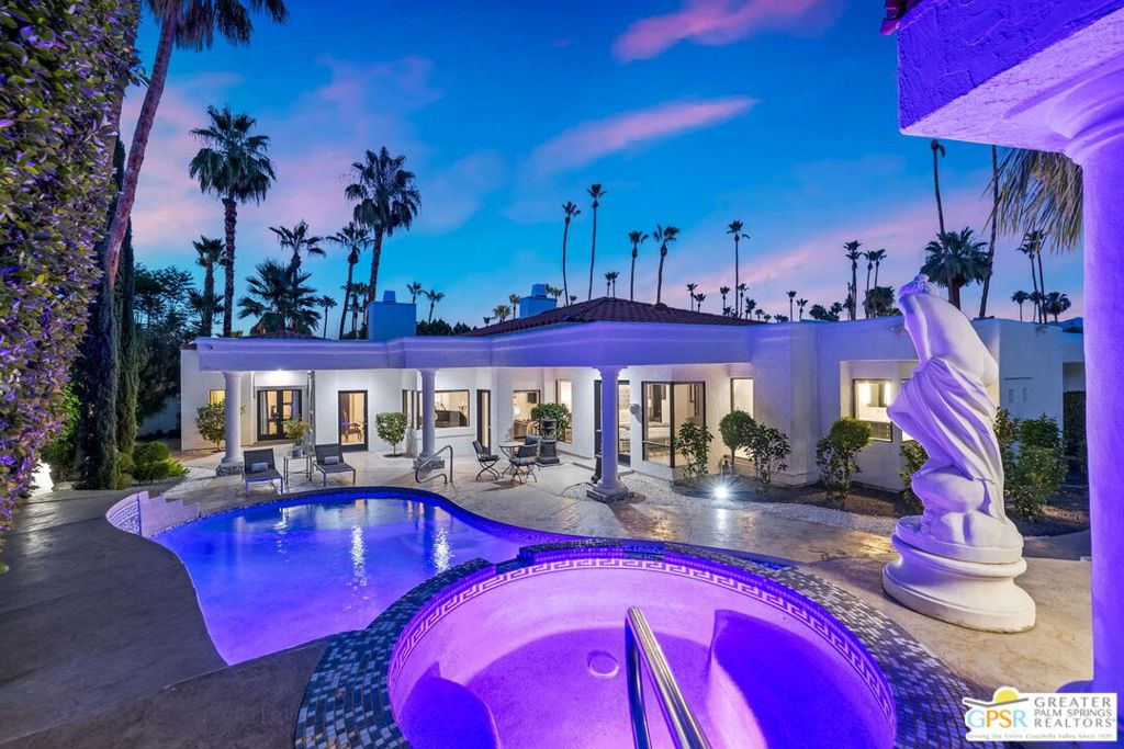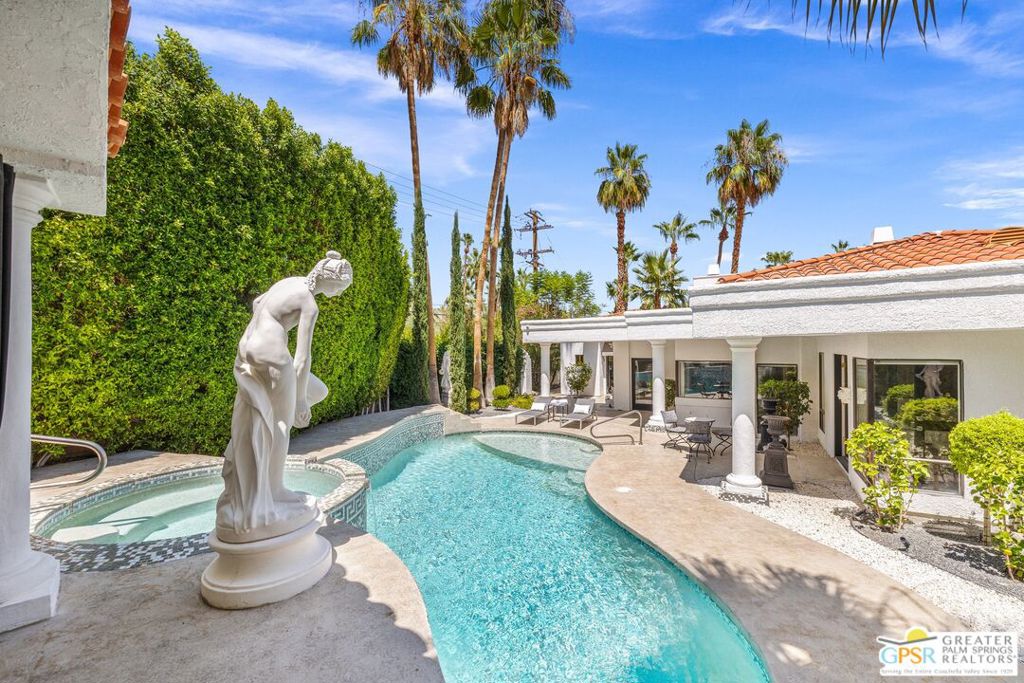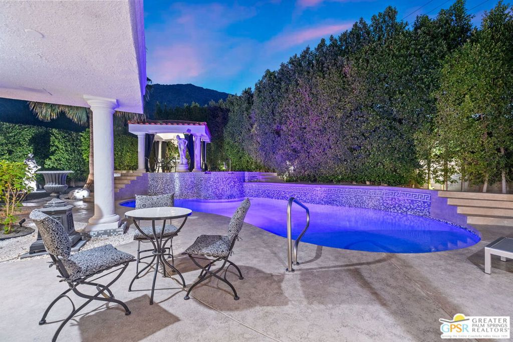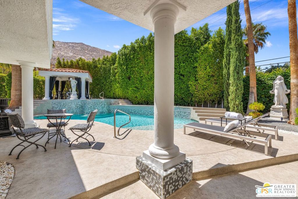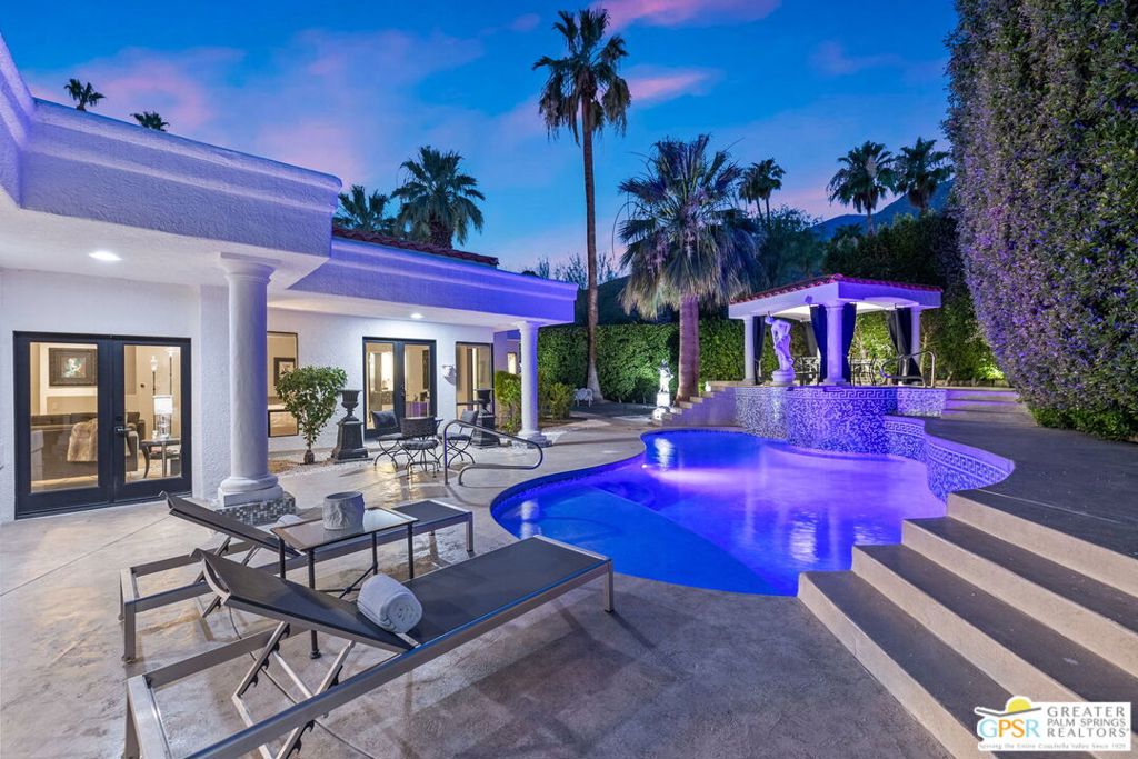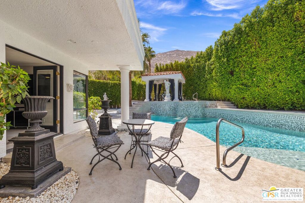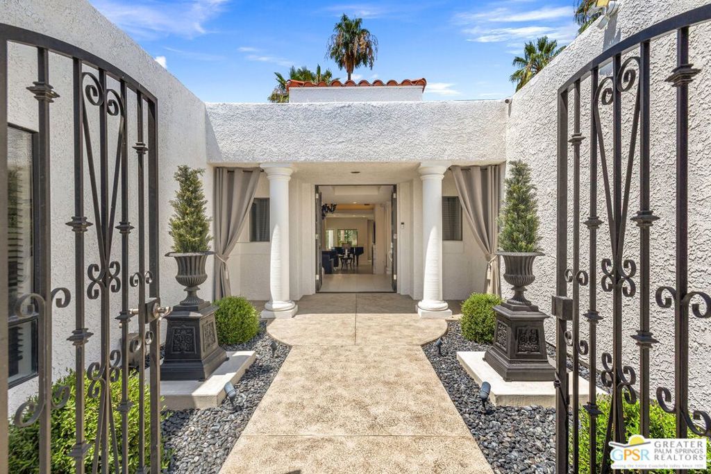 A Magical Setting in The Mesa! Perfectly positioned in one of South Palm Springs' most cherished and storied neighborhoods, this elegant 4 BED, 4.5 BATH residence offers a seamless blend of style, comfort, and desert sophistication. Set on land you own (Fee Simple) with OWNED SOLAR, the property features a circular driveway leading to a beautifully appointed 4 bedroom ensuite home. Designed for both everyday luxury and entertaining, the residence wraps around a stunning pool and spa with waterfall, dramatic mosaic tile accents, an elevated gazebo framed by mountain views and swaying palms. Multiple outdoor conversation areas enhance this ultra-private setting. The gated courtyard entry and double doors open to formal living and dining spaces with dual fireplaces and a custom bar area, also ideal as a destination-style media lounge. Notable lighting throughout includes Baccarat fixtures that complement the home's subtle nod to Hollywood Regency design. The chef's kitchen features high-end finishes, a generous buffet, walk-in pantry, and breakfast area with patio access. The spacious primary retreat offers direct pool access, a Carrara marble-lined shower, and a freestanding clawfoot tub. Two additional guest suites are thoughtfully positioned along the west wing, each with private full baths. The attached casita, located in the east wing, features two sets of French doors that open to the outdoors and floor-to-ceiling built-in bookcases. This generous space functions beautifully as a second primary suite or private retreat.Additional highlights include a large utility room, direct garage access, and a secondary entrance off Carmelita Street, perfect for pool guests or staff. Take the Matterport Virtual Tour to experience the flow and finish of this exceptional South Palm Springs property.