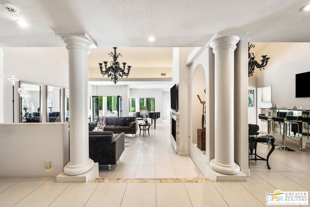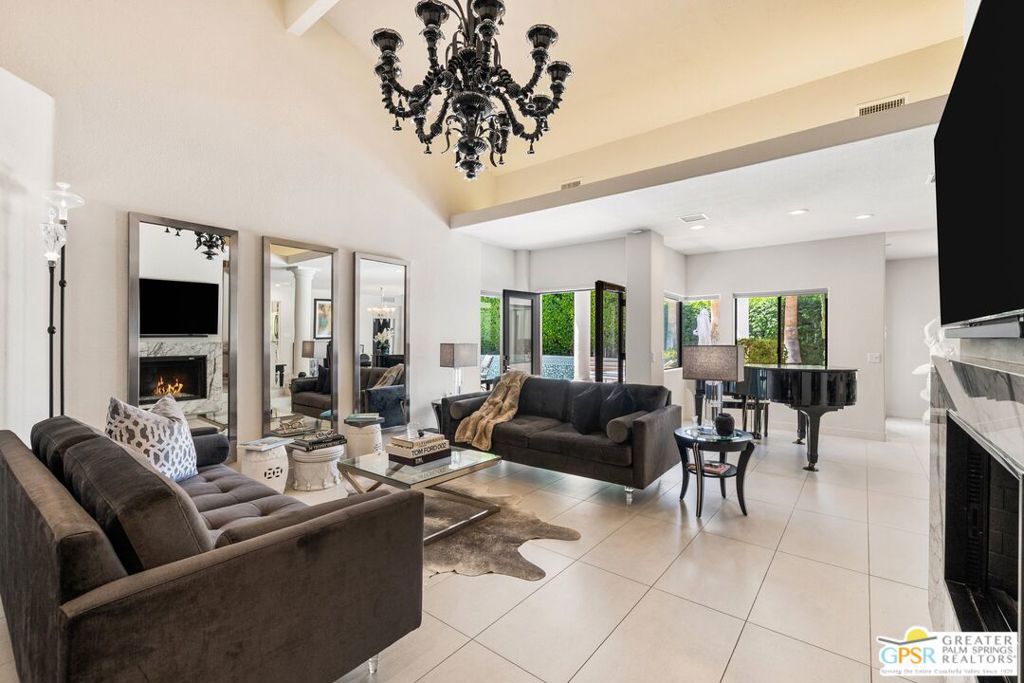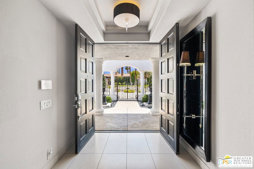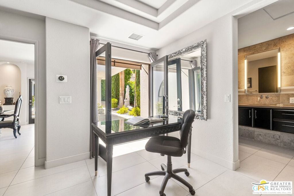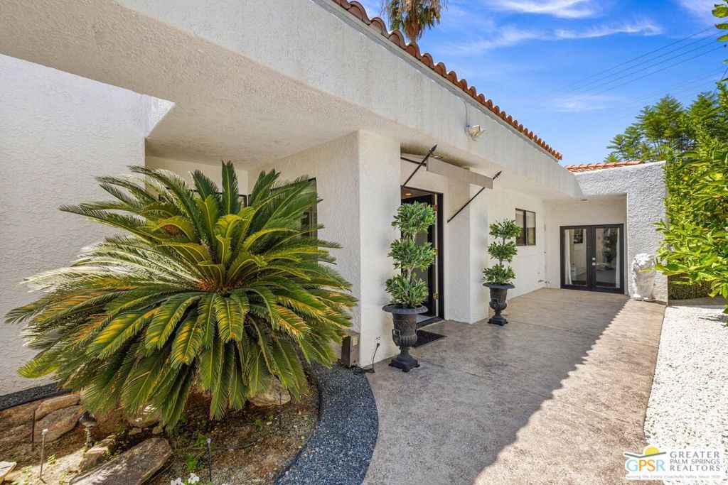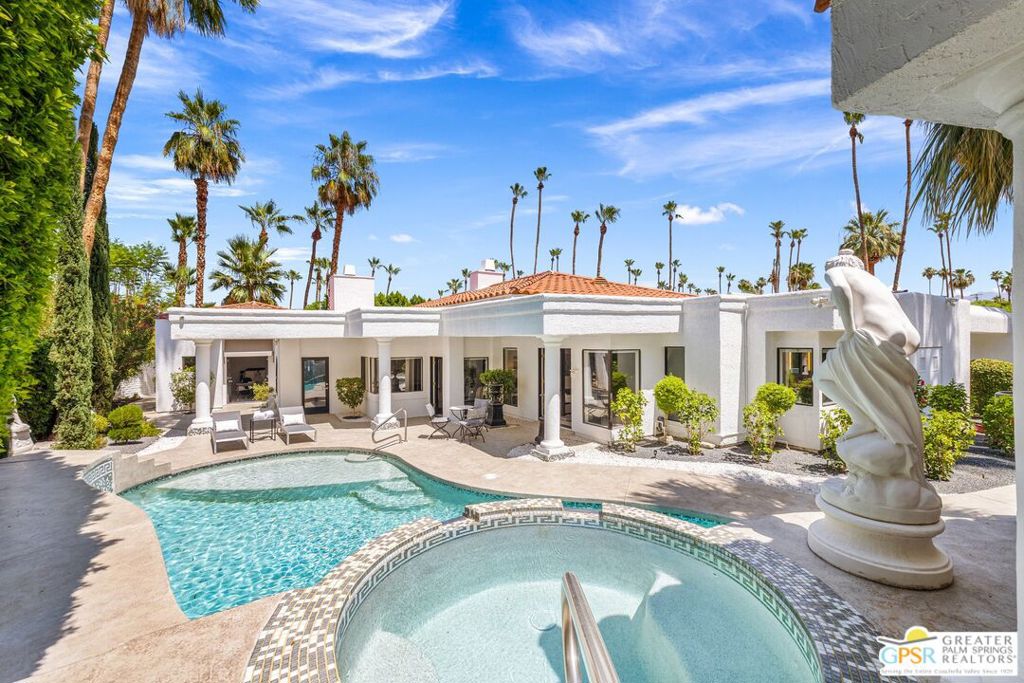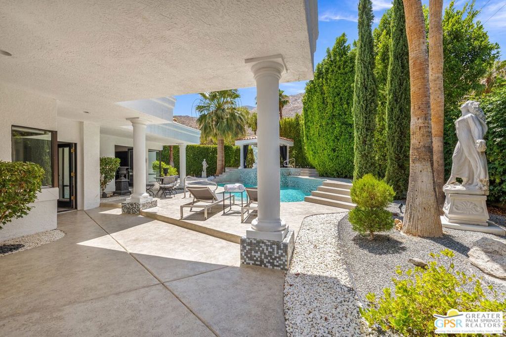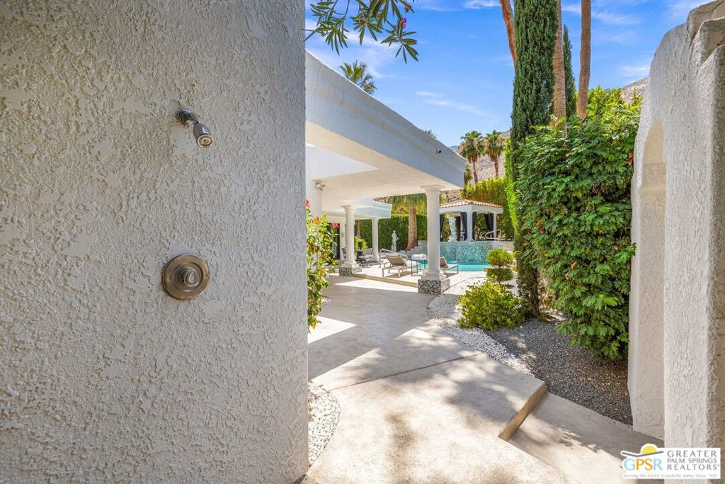 A Magical Setting in The Mesa! Perfectly positioned in one of South Palm Springs' most cherished and storied neighborhoods, this elegant 4 BED, 4.5 BATH residence offers a seamless blend of style, comfort, and desert sophistication. Set on land you own (Fee Simple) with OWNED SOLAR, the property features a circular driveway leading to a beautifully appointed 4 bedroom ensuite home. Designed for both everyday luxury and entertaining, the residence wraps around a stunning pool and spa with waterfall, dramatic mosaic tile accents, an elevated gazebo framed by mountain views and swaying palms. Multiple outdoor conversation areas enhance this ultra-private setting. The gated courtyard entry and double doors open to formal living and dining spaces with dual fireplaces and a custom bar area, also ideal as a destination-style media lounge. Notable lighting throughout includes Baccarat fixtures that complement the home's subtle nod to Hollywood Regency design. The chef's kitchen features high-end finishes, a generous buffet, walk-in pantry, and breakfast area with patio access. The spacious primary retreat offers direct pool access, a Carrara marble-lined shower, and a freestanding clawfoot tub. Two additional guest suites are thoughtfully positioned along the west wing, each with private full baths. The attached casita, located in the east wing, features two sets of French doors that open to the outdoors and floor-to-ceiling built-in bookcases. This generous space functions beautifully as a second primary suite or private retreat.Additional highlights include a large utility room, direct garage access, and a secondary entrance off Carmelita Street, perfect for pool guests or staff. Take the Matterport Virtual Tour to experience the flow and finish of this exceptional South Palm Springs property.