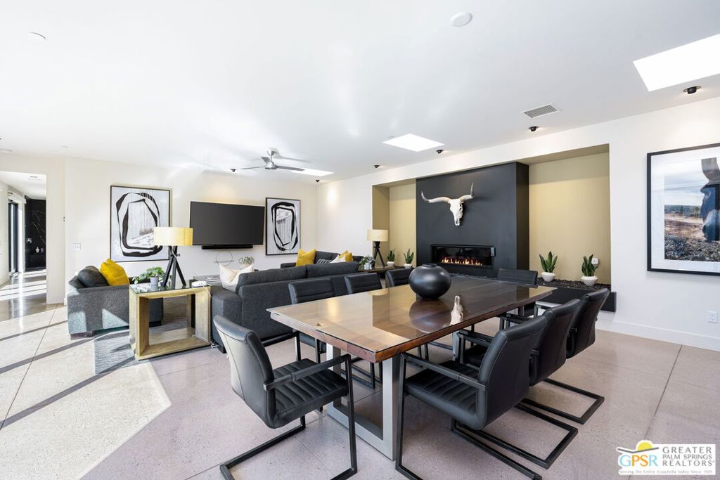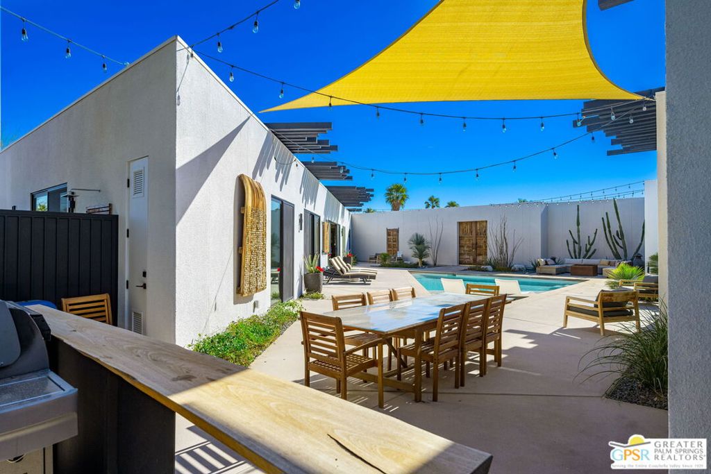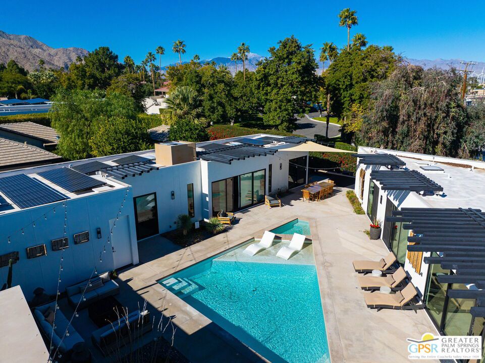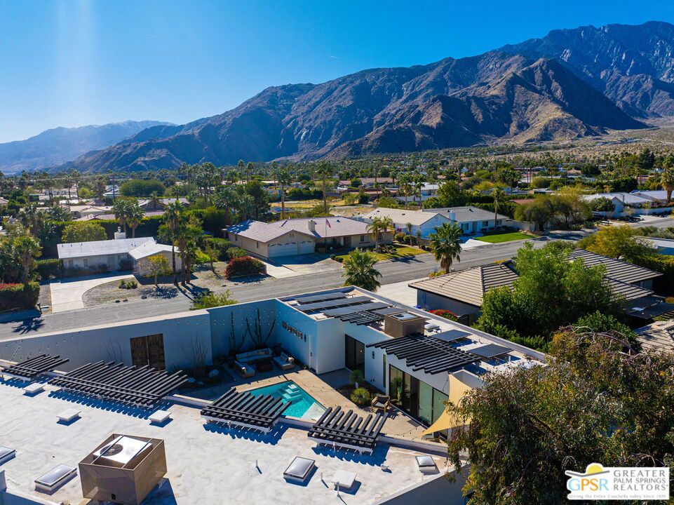 Located in the Historical Racquet Club District of Palm Springs, this compound-like property offers every modern amenity one would want in a custom home. Completed in 2022, this home offers five bedrooms, five bathrooms, and is COMPLETELY TURNKEY FURNISHED! Situated on a large lot, the home is comprised of two sections. The main living area which has a large owner's suit, a large great room that flows into the cook's kitchen and all with views on Mount San Jacinto. There is also an executive suite, or secondary owner's suite. Across from the pool is the guest area which includes two bedrooms with a living room (which is also used as a bedroom), two bathrooms, a kitchenette, and a laundry closet. This Unique Modern Courtyard home was designed for privacy. All windows are within the courtyard looking out at the pool and mountain views. The pool area has multiple seating areas, a fire pit and barbecue area, and an outdoor shower. Built for today's modern living, this home is low maintenance with desertscape and drip irrigation, a tankless water heater, and an owned solar system. This has been used as a second home, but also as a vacation rental bringing in $1000 a day when rented. Just bring your personal belongings and you are ready to enjoy this wonderful property!